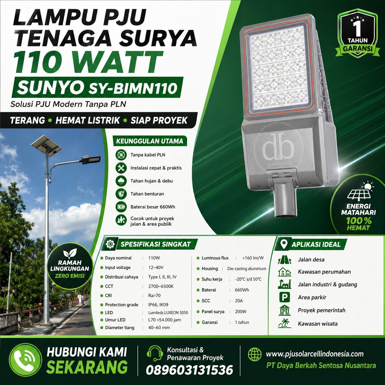 Bagi pembeli proyek, spesifikasi harus diterjemahkan menjadi manfaat praktis. Panel berarti sumber energi, baterai berarti cadangan daya, lumen berarti tingkat terang, IP66 berarti ketahanan cuaca, dan garansi berarti perlindungan investasi. Karena itu, sebelum membeli harga lampu PJU solar cell 100 watt, mintalah datasheet resmi, foto produk, garansi, dan rekomendasi teknis pemasangan. Untuk kebutuhan desa, gudang, area parkir, dan jalan lingkungan, pilihan yang tepat adalah Lampu PJU Solar cell All in One 100 watt.