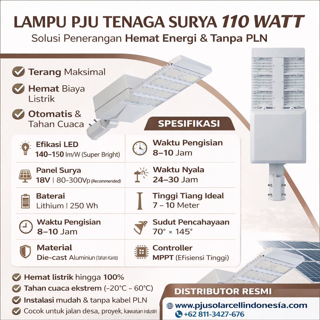 Lampu PJU Solar Cell Two in One untuk pabrik dan kawasan industri Cikarang adalah solusi penerangan modern yang mampu menekan biaya operasional listrik hingga 100%. Menggunakan panel surya terpisah berkapasitas besar, lampu ini memberikan pencahayaan maksimal untuk area outdoor seperti jalan internal, area parkir, loading dock, hingga area kontainer. Perlindungan IP66 menjamin lampu tahan hujan, debu, dan korosi — sangat cocok untuk lingkungan industri yang penuh polusi. Teknologi baterai LiFePO4 membuat umur pakai lebih panjang dan aman. Dengan sistem kontrol otomatis dan fitur dimming, lampu tetap terang namun tetap hemat energi. Cocok untuk perusahaan yang ingin menerapkan konsep sustainability dan efisiensi biaya jangka panjang.
